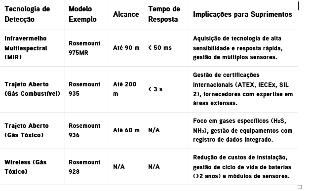 A detecção precoce de chamas em tanques de armazenamento é uma das principais barreiras de segurança para evitar catástrofes. A engenharia define os requisitos técnicos baseados em análises de risco, mas é a área de suprimentos que viabiliza a implementação dessas soluções, navegando em um mercado de fornecedores globais e tecnologias complexas. A tabela abaixo, baseada em soluções de ponta como as da Emerson [3], ilustra a complexidade e as implicações para a cadeia de suprimentos: