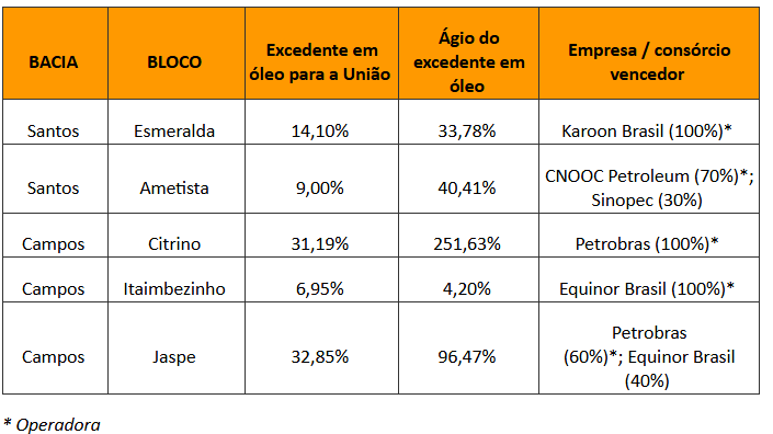 Todos os blocos arrematados tiveram ofertas de excedente em óleo para a União maiores do que o mínimo do edital. O ágio médio do excedente em óleo foi de 91,20%. O maior ágio foi de 251,63%, no bloco de Citrino.