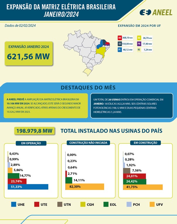 Em janeiro, o incremento verificado foi de 621,56 MW, sendo 422,20 MW provenientes de fonte eólica, 198,12 MW de centrais fotovoltaicas e 1,24 MW de pequenas centrais hidrelétricas.