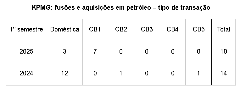 As empresas de petróleo e gás realizaram 10 operações de fusões e aquisições, no primeiro semestre deste ano. Trata-se de uma queda de quase 30% em comparação com o mesmo período de 2024, quando foram fechados 14 negócios. O estudo é feito trimestralmente pela KPMG com 43 setores da economia.