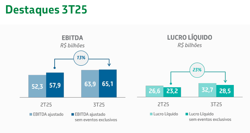 Petrobras alcançou um lucro líquido de R$ 32,7 bilhões (US$ 6 bilhões) no terceiro trimestre de 2025. Comparado ao segundo trimestre de 2025, o lucro cresceu 23%.  O desempenho operacional desse trimestre, impulsionado pela produção de óleo e gás de 3,14 MMboed (milhões de barris de óleo equivalentes por dia), levou a companhia a registrar um Fluxo de Caixa Operacional de R$ 53,7 bilhões (US$ 9,9 bilhões) a partir de um EBITDA ajustado de R$ 63,9 bilhões (US$ 11,7 bilhões).